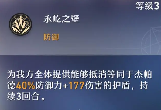 为我方全体提供能够抵消等同于杰帕德36%防御力+120/38%防御力+162/40%防御力+177/43%防御力+186/45%防御力+195/48%防御力+240数值的护盾,持续3回合。