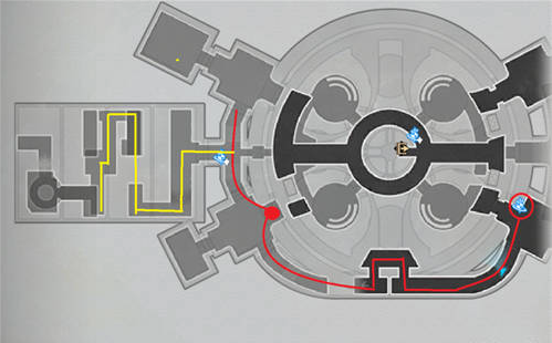 2、见下图,传送到红圈内的传送点,按照标记路线前进,可以遇到三只怪物。之后返回黄线处继续深入,在里面还有两只。
