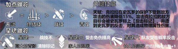 天赋:克拉拉在史瓦罗的保护下受到敌方攻击的伤害降低15%。攻击克拉拉的敌方目标会被史瓦罗标上【反击标记】,并遭到史瓦罗的反击,对其造成物理属性伤害。