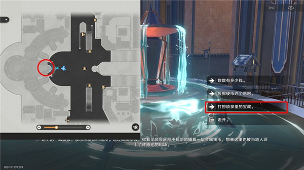 与喷泉互动,选择打捞喷泉里的宝藏选项。