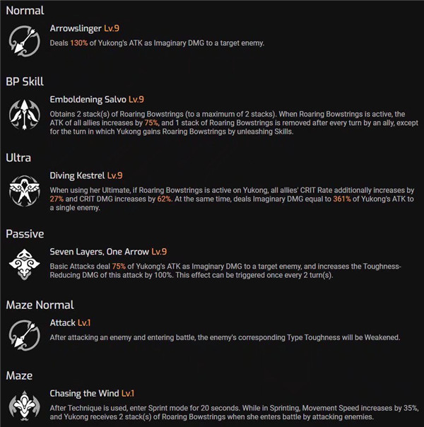 战技:获得两层“咆哮弓弦”buff,激活时全队加75%攻击力,每个友方行动一轮就会移除一层buff,驭空释放战技获得的那轮除外。