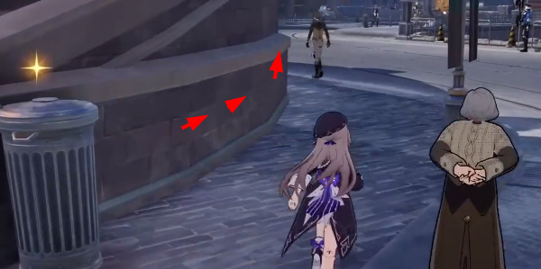 4、沿着下图箭头方向移动,在墙壁的左侧可以找到第三章通缉令。