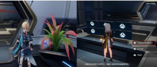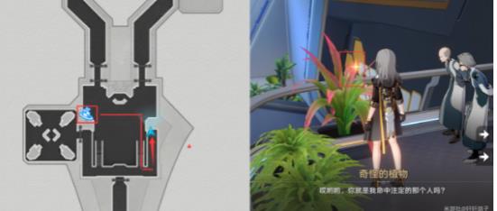 2、来到基座舱段如图所示的位置,与奇怪的植物对话, 给它浇什么都行,最后都得选纯净水。浇水后会给黑塔币,说第二天再来,根据测试服,明天再来浇水还有奖励。