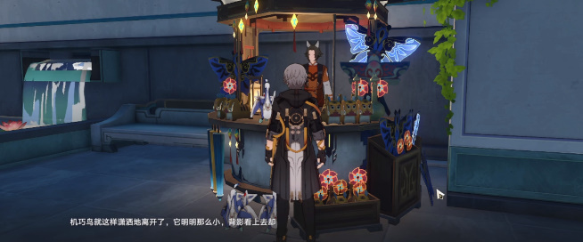 1、首先传送到星槎海中枢下图这个位置,到达之后在一个卖货的地方可以看到一个不满的小鸟,上前跟他对话;