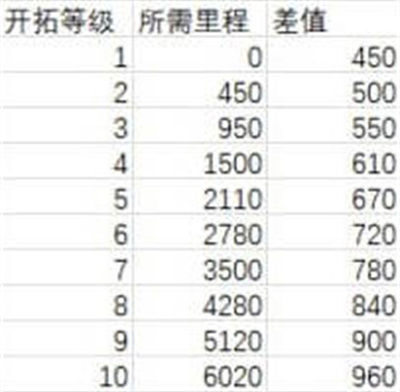2:开拓者1级所需里程0,2级里程450,3级里程950,4级里程1500,5级里程2110,6级里程2780,7级里程3500,8级里程4280,9级里程5120,10级里程6020;