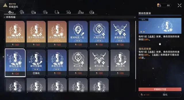 核心祝福:反物质非逆方程(生命低50%+20战意)、预兆性景深(战意减伤)、毁灭性吸积(扣血加攻)、原生黑洞(堆毁灭加攻)