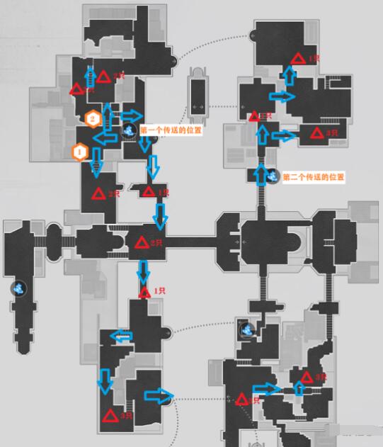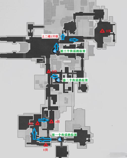 注意点在于在第三个传送的位置时,可以顺路往北面楼梯上二层,清掉2层的两只怪。