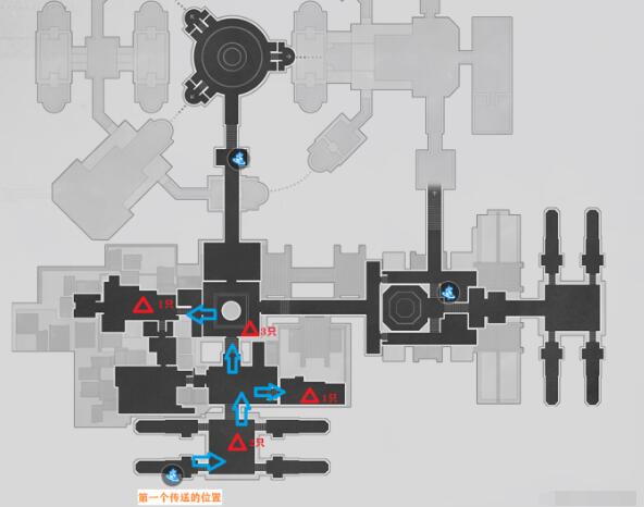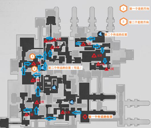 注意点在于第一个传送的位置,这里是有两种跑法的,视频里有讲,但图没画第二种,而且可能不太清晰这里,有人可能懵。