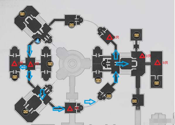 注意的点在于,跟着环形道走,路上有怪就打,旁边平台有怪就打。绕一圈就可清完。