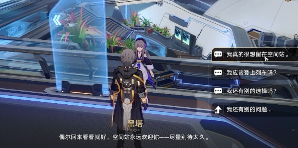 1、首先找到黑塔进行互动操作,选择我真的很想留在空间站。