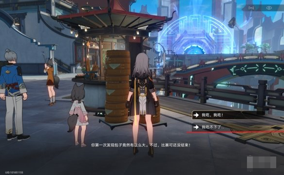 来到小吃店前,与商店老板对话,参加大胃王比赛