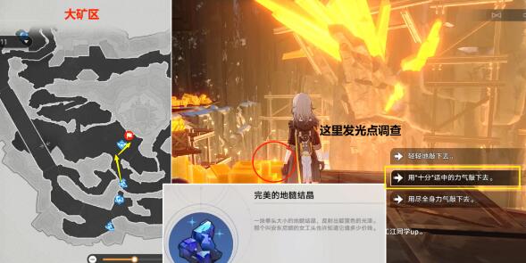 (2)然后去下图【大矿区】位置,发光点处【调查】后,选择【用‘十分’适中的力气敲下去】,即可会获得【完美的地髓结晶】