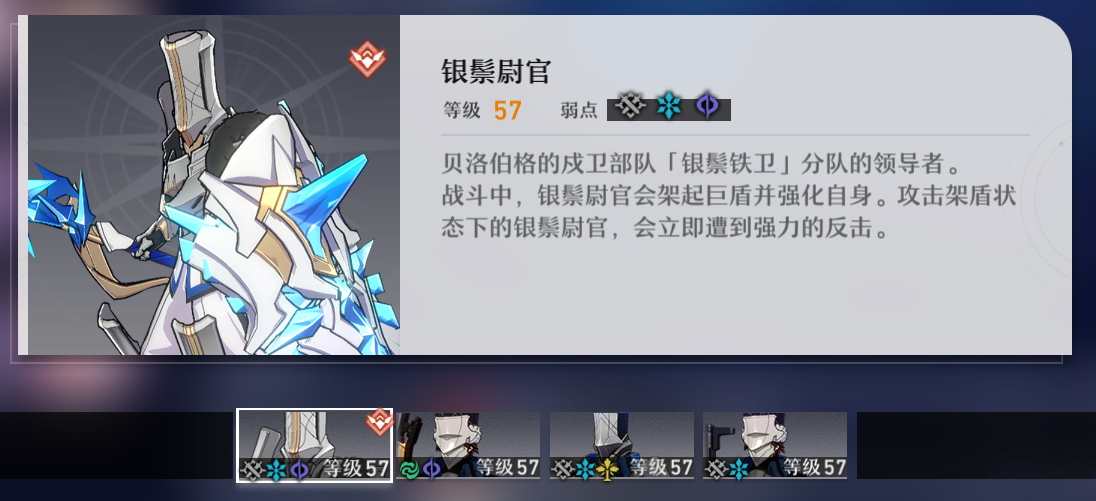 第二波会出现【银鬃尉官】,技能机制较为简单,,合理运用对应属性击破其护盾条进行输出即可。【银鬃尉官】护盾条回复后会使用技能【盾反】并召唤两个士兵.......也没啥用。