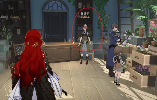 2、来到这里之后,可以看到有花店,进入这里的花店,与员工瓦丝卡对话;