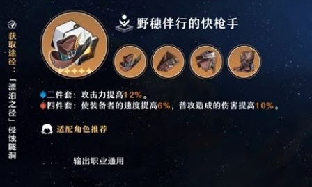 快枪手类比原神中的圣遗物-角斗士,提供通用的攻击力加成,4件套提供加速效果利好前期的所有输出角色,与下面的各类属性加成套装差距并不会太大,没有其他选择的最佳选择;