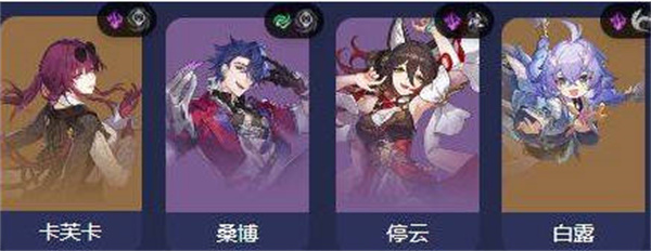 2:这个配队就是常规的配队了,卡芙卡负责输出,而且是持续伤害的机制,通过触电爆发伤害的,首先我们要保障这个阵容的停云角色速度和能量的恢复;