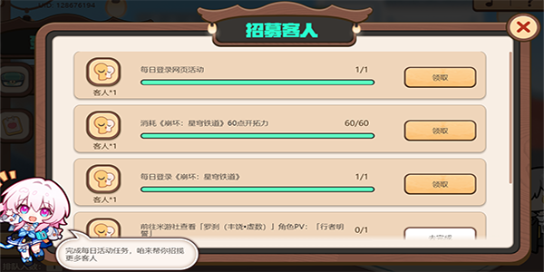 2、活动期间,完成开店引导将获得2名客人的美食委托,每日登录网页活动均可获得1名客人的美食委托。此外,完成活动任务,三月七每日将至多帮开拓者招揽4名客人。