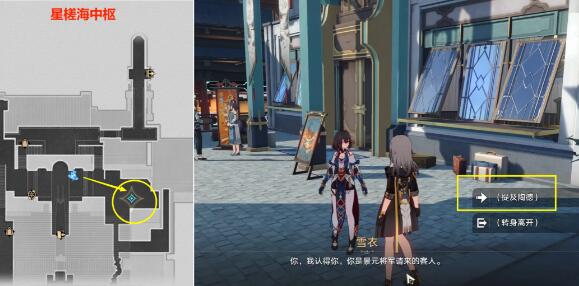 (7)然后再来到下图【星槎海中枢】位置,找【雪衣】对话后,任务就会和上面一样了,会让我等陶德的消息,还得等到现实明天