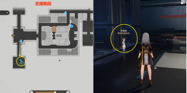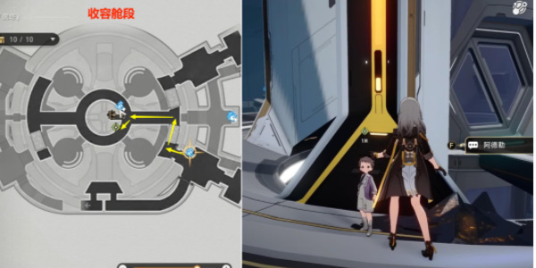 1、首先前往图中提示的支援舱段找阿德勒对话,接取任务。