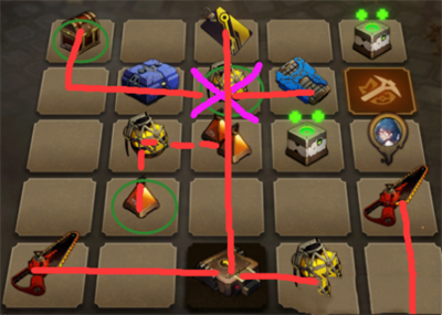 门卡再试用角色对角,玩家先去黑线拿炸弹(可以不拿),红色线打怪。