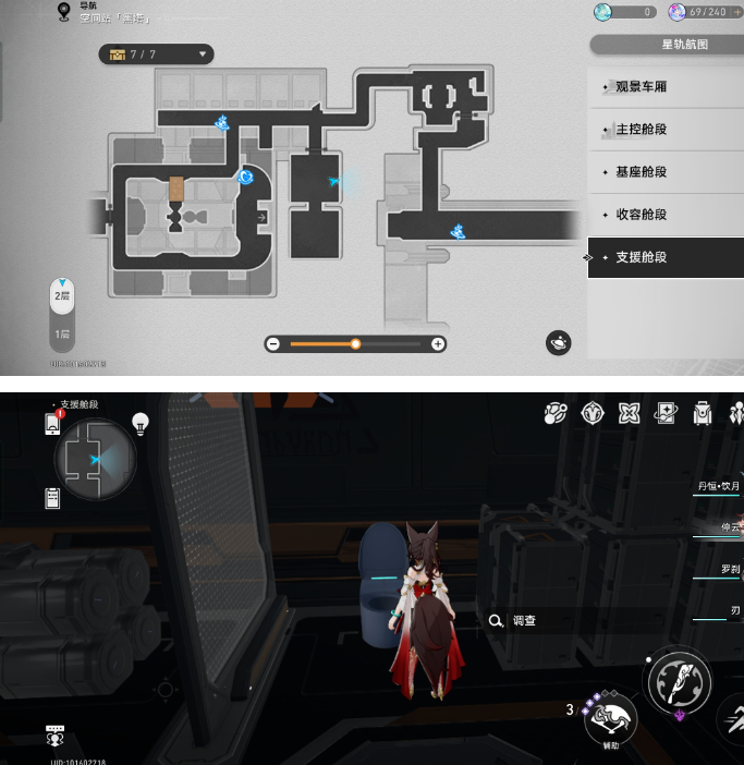 1、玩家需要前往支援舱段的下图位置找到马桶并进行调查,接着需进行对话,选框选择坐上去,按冲水键。