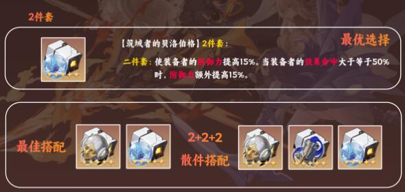 解析:筑城者的贝洛伯格2件套是核心,防御力提高,命中效果也会提升,还可以让嘲讽几率增加。