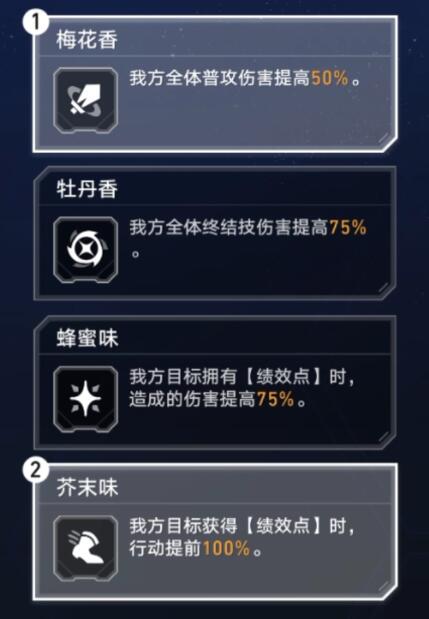 解析:梅花香提高了队伍的普攻伤害,可以提高队伍的斩杀线。芥末味可以在夺取绩效点之后提升全队的行动条,让你可以更好的进行输出。
