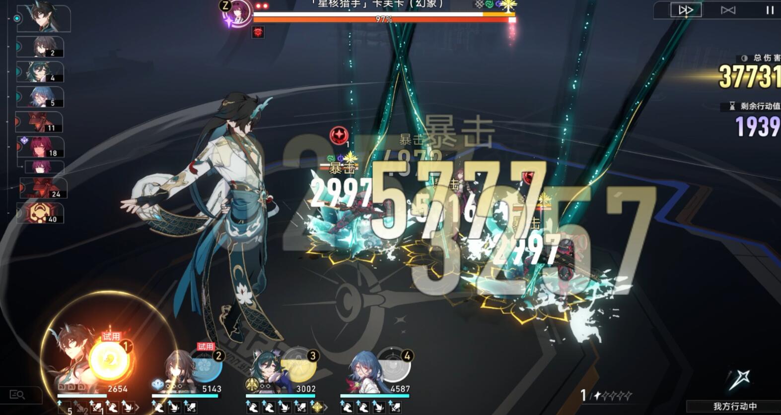 2、阮梅使用战绩,副c和生存位平A消除卡芙卡韧性,饮月选择召唤的员工开大,击破弱点拉条。