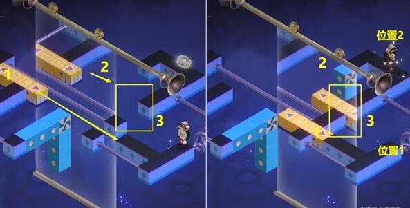 (2)将2镜子移动到下面这个地方,使3位置拼接到一块后,【钟表小子】会从位置1到位置2