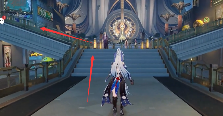 2、传送到达之后,回头走上楼梯之后左转,到达看到下图箭头位置有一个喷钞机;