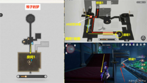 1)进入下面【房间1】后,右前方就是【记忆冰泉】贴纸,然后从【酒塔1】位置获取【梦泡充能次数】后,从【桥梁1】位置上去