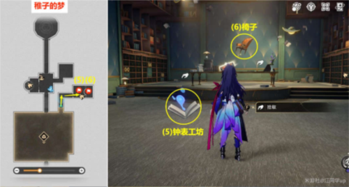 4)从上图右边门进去后,就会走出【房间1】,然后再从前面右边门进去,就来到下图的房间里,【钟表工坊】贴纸拾取获得,【椅子】贴纸需要【调查】椅子下发光点获得