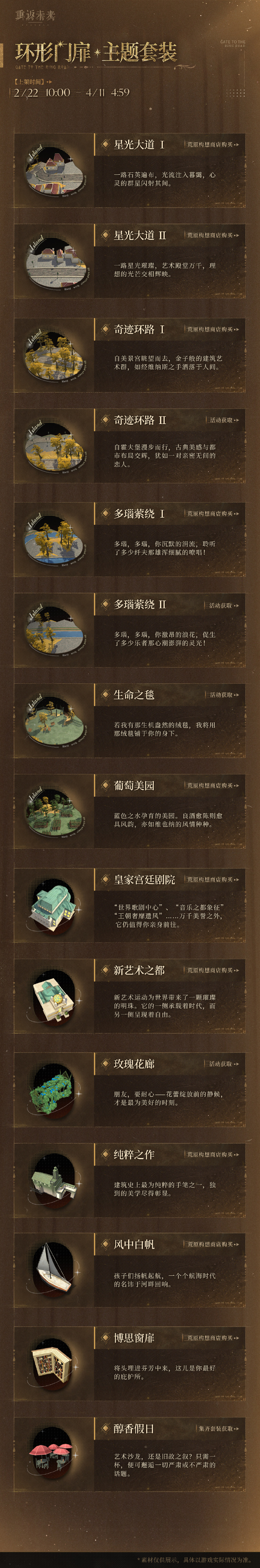 活动期间【环形门扉】主题套装(部分)将在荒原商店上架并限时售卖;
