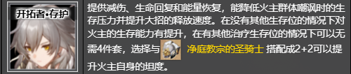 提供减伤、生命回复和能量恢复,能降低火主群体嘲讽时的生存压力并提升大招的释放速度。在没有其他生存位的情况下对火主的生存能力有提升,在有其他治疗生存位的情况下可以无需4件套,选择与净庭教宗的圣骑士搭配成2+2可以提升火主自身的坦度。
