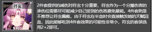 2件套提供的减伤对符玄十分重要,符玄作为一个分摊伤害的承伤位需要尽可能减少自己受到的伤害避免暴毙。4件套则是不推荐让符玄佩戴,由于符玄在半血时会直接触发她的天赋回血,因此能够吃到4件套效果的可能性非常小,符玄的套装选用2+2即可。