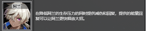 在降低阿兰的生存压力的同时提供减伤和回复,提供的能量回复可以让阿兰更快释放大招。