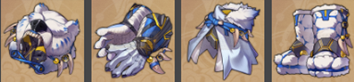 套装部件:雪猎的荒神兜帽、雪猎的巨蜥手套、雪猎的冰龙披风、雪猎的鹿皮软靴