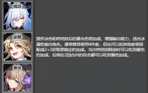 提供冰伤和终结技后的暴击伤害加成,增强输出能力,适合冰属性输出角色。通常推荐使用4件套,但也可以和其他套装搭配成2+2获取更稳定的加成。当次终结技释放时可以吃到暴伤的加成,后续在2回合内的攻击都可以吃到暴伤加成。
