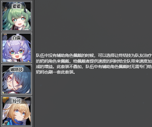队伍中没有辅助角色佩戴的时候,可以选择让终结技为队友治疗的奶妈角色来佩戴,给佩戴者提供速度的同时给全队带来速度加成的增益。此套装不叠加,队伍中有辅助角色佩戴时无需专门给奶妈也刷一套此套装。