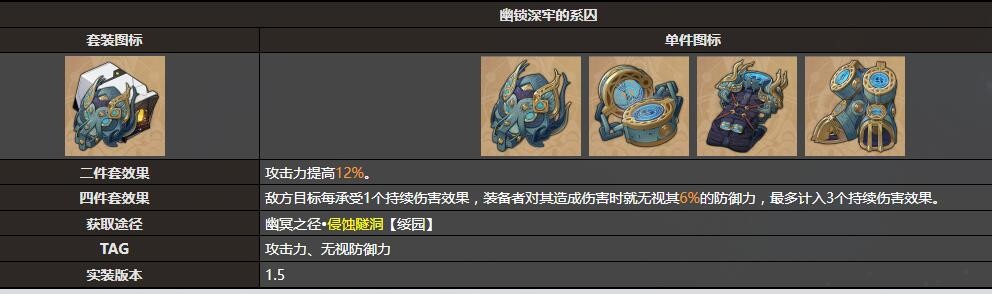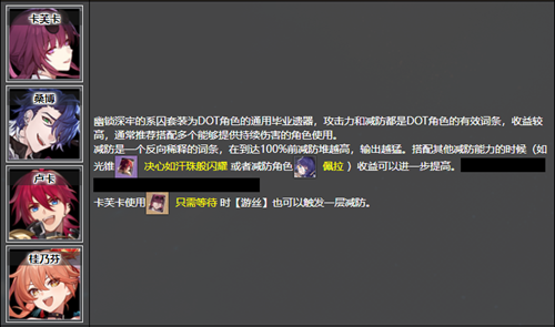 此套装可以说是所有拥有DOT角色的通用毕业遗器,其携带的攻击力和减少防御对于DOT角色来说都是有效词条,对于他们来说收益非常高,最好是搭配几个能够提供持续伤害的角色使用。减少地方防御是这个遗器的主要能力,自然是减防越高越厉害,还能给角色搭配一些有类似效果的光锥。
