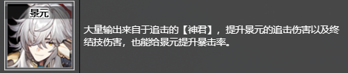 大量输出来自于追击的【神君】,提升景元的追击伤害以及终结技伤害,也能给景元提升暴击率。