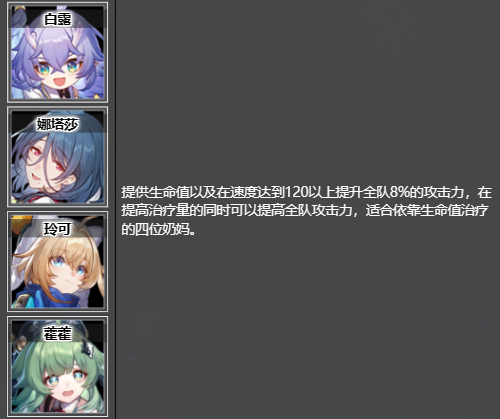 提供生命值以及在速度达到120以上提升全队8%的攻击力,在提高治疗量的同时可以提高全队攻击力,适合依靠生命值治疗的四位奶妈。
