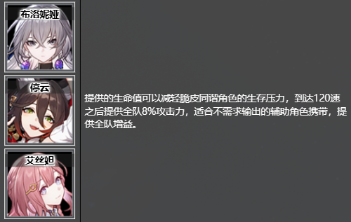 提供的生命值可以减轻脆皮同谐角色的生存压力,到达120速之后提供全队8%攻击力,适合不需求输出的辅助角色携带,提供全队增益。