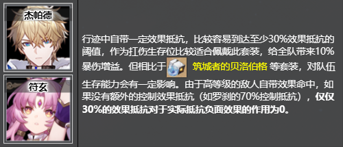 行迹中自带一定效果抵抗,比较容易到达至少30%效果抵抗的阈值,作为扛伤生存位比较适合佩戴此套装,给全队带来10%暴伤增益。但相比于筑城者的贝洛伯格 等套装,对队伍生存能力会有一定影响。由于高等级的敌人自带效果命中,如果没有额外的控制效果抵抗(如罗刹的70%控制抵抗),仅仅30%的效果抵抗对于实际抵抗负面效果的作用为0。