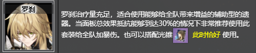 罗刹治疗量充足,适合使用能够给全队带来增益的辅助型的遗器。当面板总效果抵抗能够到达30%的情况下非常推荐使用此套装给全队加暴伤。也可以搭配光锥此时恰好使用。