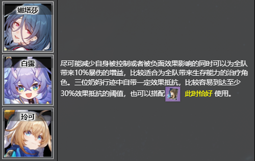 尽可能减少自身被控制或者被负面效果影响的同时可以为全队带来10%暴伤的增益,比较适合为全队带来生存能力的治疗角色。三位奶妈行迹中自带一定效果抵抗,比较容易到达至少30%效果抵抗的阈值,也可以搭配此时恰好使用。