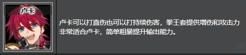 卢卡可以打直伤也可以打持续伤害,拳王套提供增伤和攻击力非常适合卢卡,简单粗暴提升输出能力。
