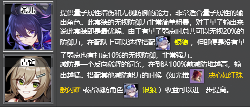 提供量子属性增伤和无视防御的能力,非常适合量子属性的输出角色。此套装的无视防御力非常简单粗暴,对于量子输出来说此套装即是最优解。由于有量子弱点时总共可以无视20%的防御力,在配队上可以选择搭配银狼,但即便是没有量子弱点也有打底10%的无视防御,非常强力。