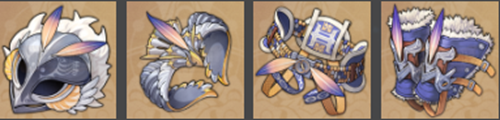 套装部件:翔鹰的长喙头盔、翔鹰的鹰击指环、翔鹰的翼装束带、翔鹰的绒羽绑带