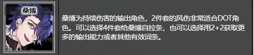 桑博为持续伤害的输出角色,2件套的风伤非常适合DOT角色。可以选择4件套给桑博自拉条,也可以选择用2+2获取更多的输出能力或者其他有效词条。